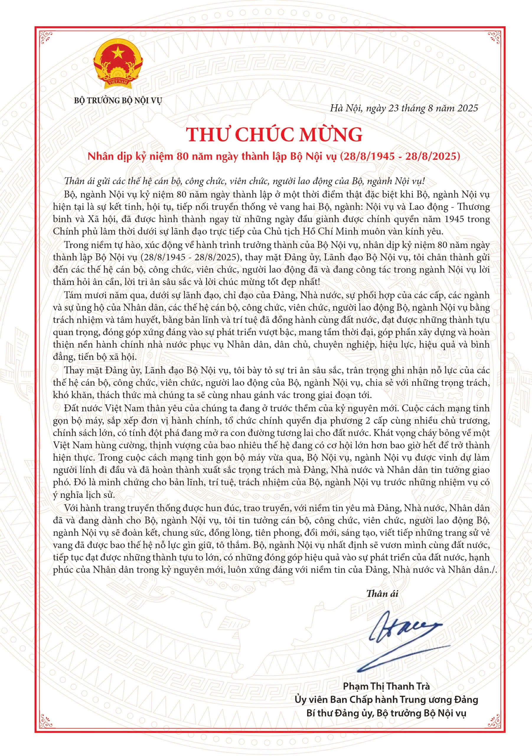 Thư chúc mừng nhân dịp kỷ niệm 80 năm ngày thành lập Bộ Nội vụ (28/8/1945 - 28/8/2025)